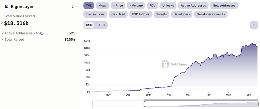 EIGEN-tokenia käytetään panostamiseen ETH-panostuksen rinnalla. Vielä tärkeämpää on, että protokolla on hämmästyttänyt tähän mennessä lukittua yli 18 miljardin dollarin kokonaisarvoa.