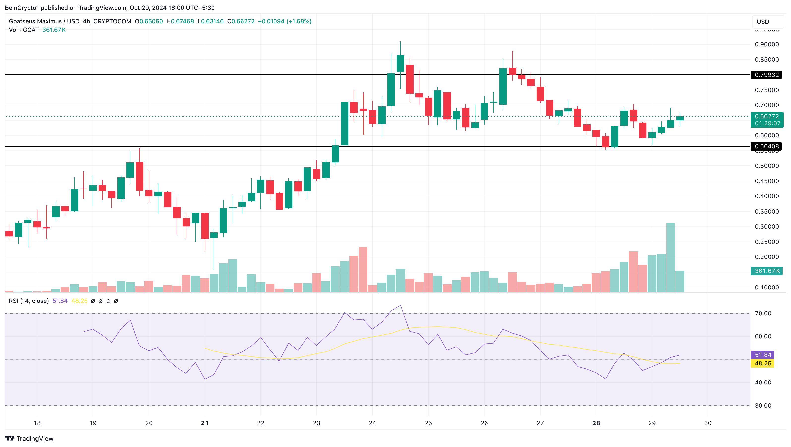 Tätä kirjoitettaessa GOATin hinta on 0,66 dollaria, laskien 26%:lla sen kaikkien aikojen korkeimmasta. kuitenkin Suhteellinen Voimaindeksi (RSI) osoittaa, että altcoin saattaa pian lähestyä aiempaa hintaansa. RSI mittaa momenttia, ja koska lukema on ylittänyt neutraalin viivan uudelleen, se tarkoittaa, että trendi on härkämäinen.
