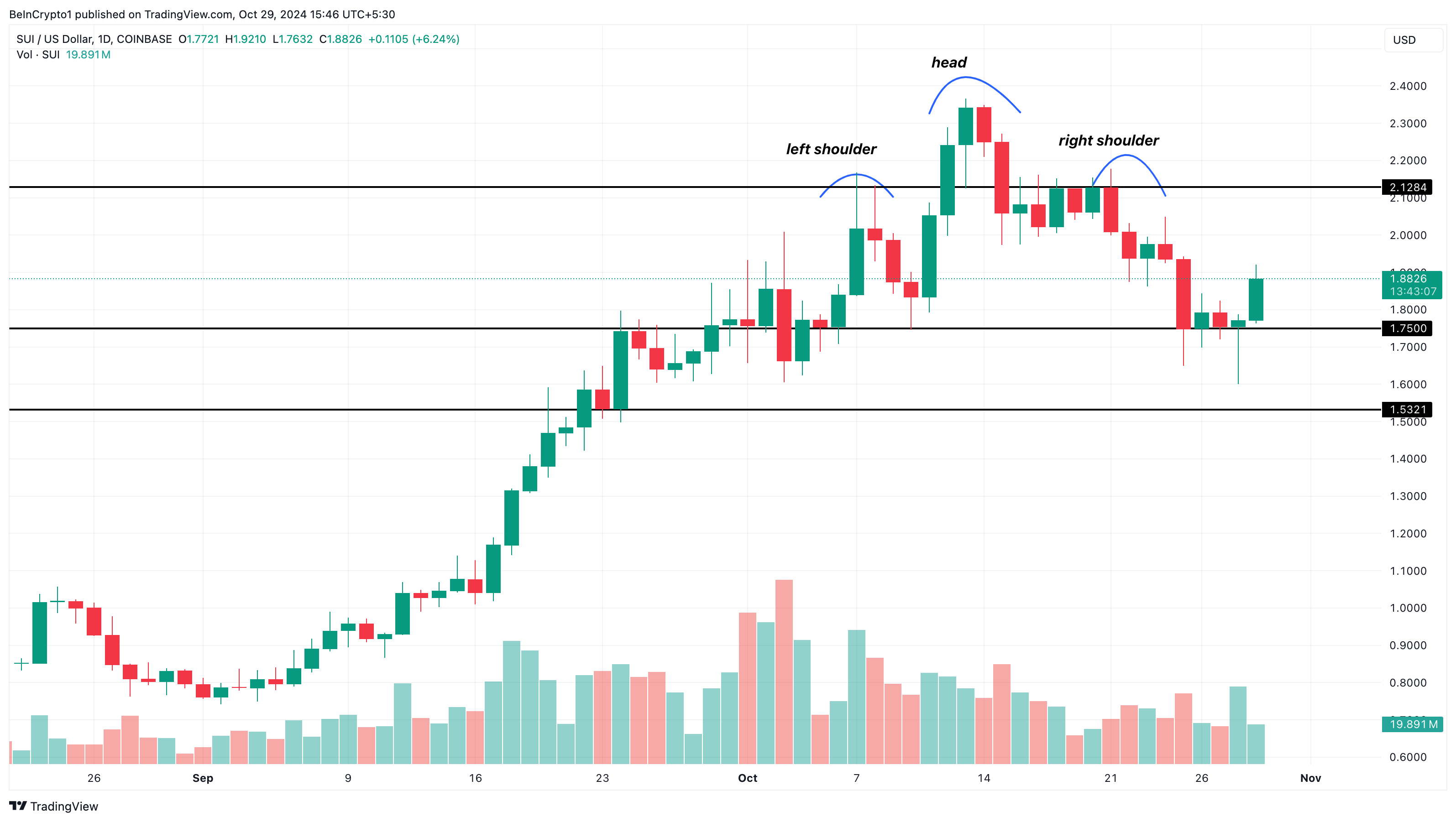 Tämä toiminnan lisääntyminen heijastaa lisääntynyttä kiinnostusta Sui-ekosysteemiin ja oli myös tärkeä altcoinin palautumiselle 1,88 dollariin. Teknisestä näkökulmasta SUI muodosti aluksi pää ja hartiat -kuvion.