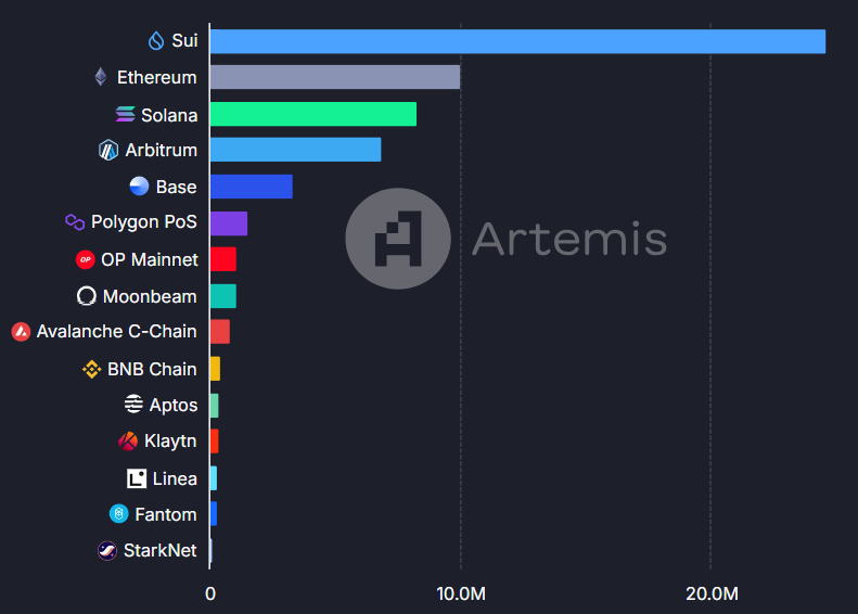 Sui oli eilen trendaavien altcoinien listalla. Tänään se on myös trendaavien kolikoiden joukossa merkittävän hinnannousunsa ansiosta viimeisen 24 tunnin aikana. Lisäksi Sui-verkosto koki merkittäviä sijoituksia, mikä nosti sen sijoitusta monien johtavien lohkoketjujen yläpuolelle.