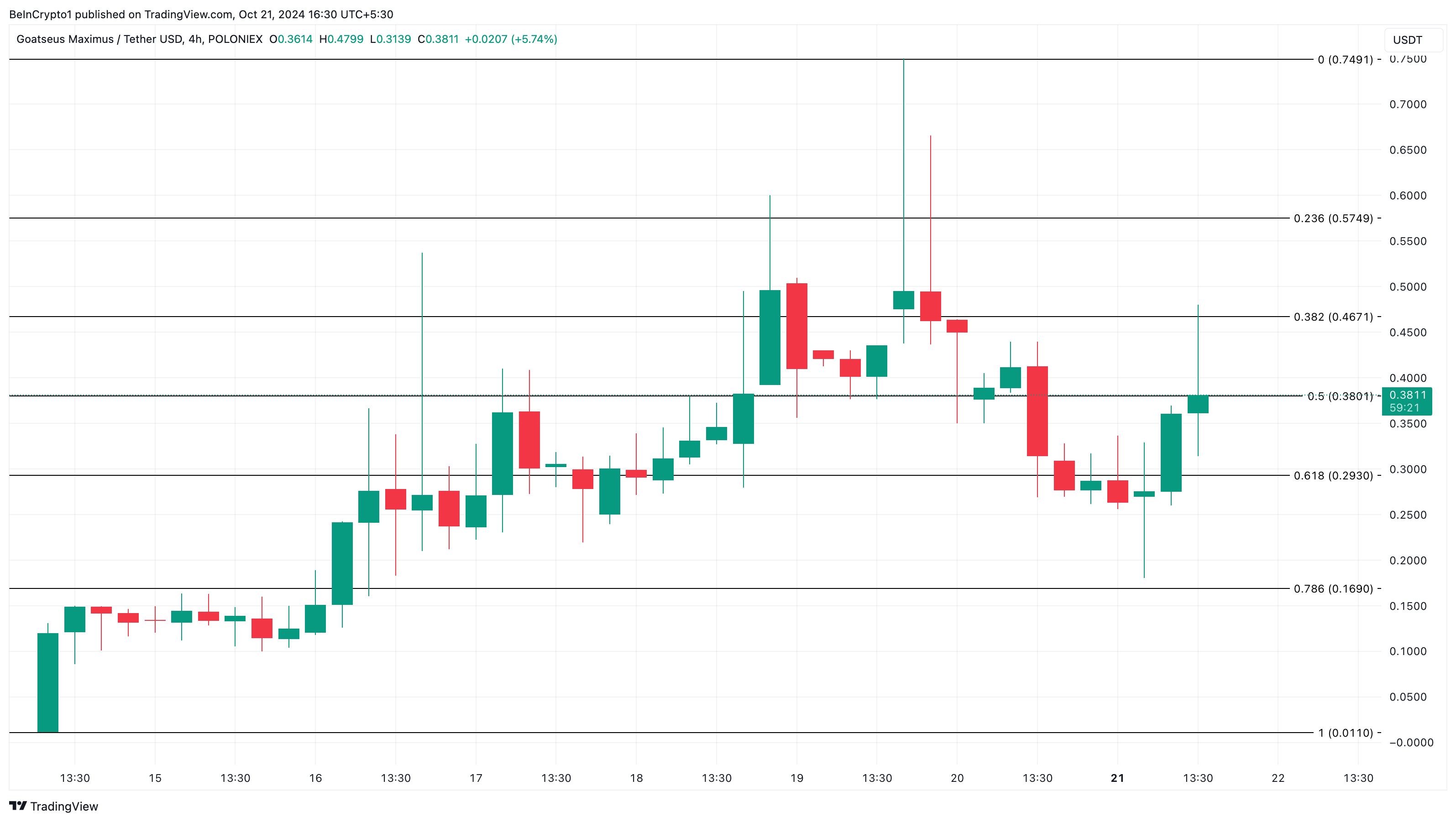 Tämän kehityksen seurauksena GOATin hinta nousi jälleen ja on tällä hetkellä 0,40 dollaria. Kuitenkin, jos suuri kertyminen jatkuu, altcoinin arvo saattaa lyhyellä aikavälillä nousta 0,58 dollariin.