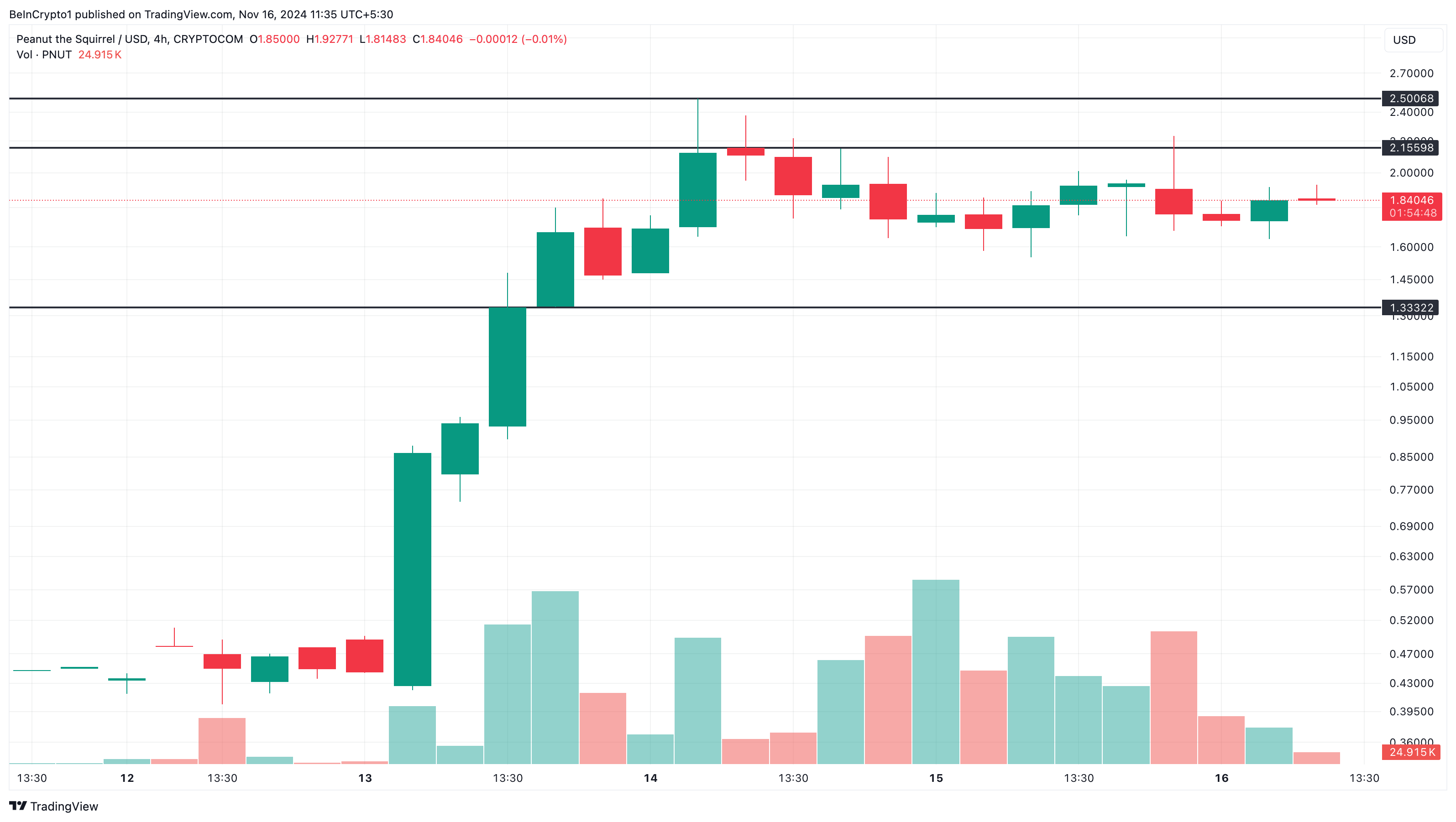 Kuitenkin härkämäinen tunnelma voisi kumota tämän näkemyksen. Tässä tapauksessa PNUT voisi nousta 2,16 dollariin tai rallia kohti uutta kaikkien aikojen korkeinta hintaa 2,50 dollaria.