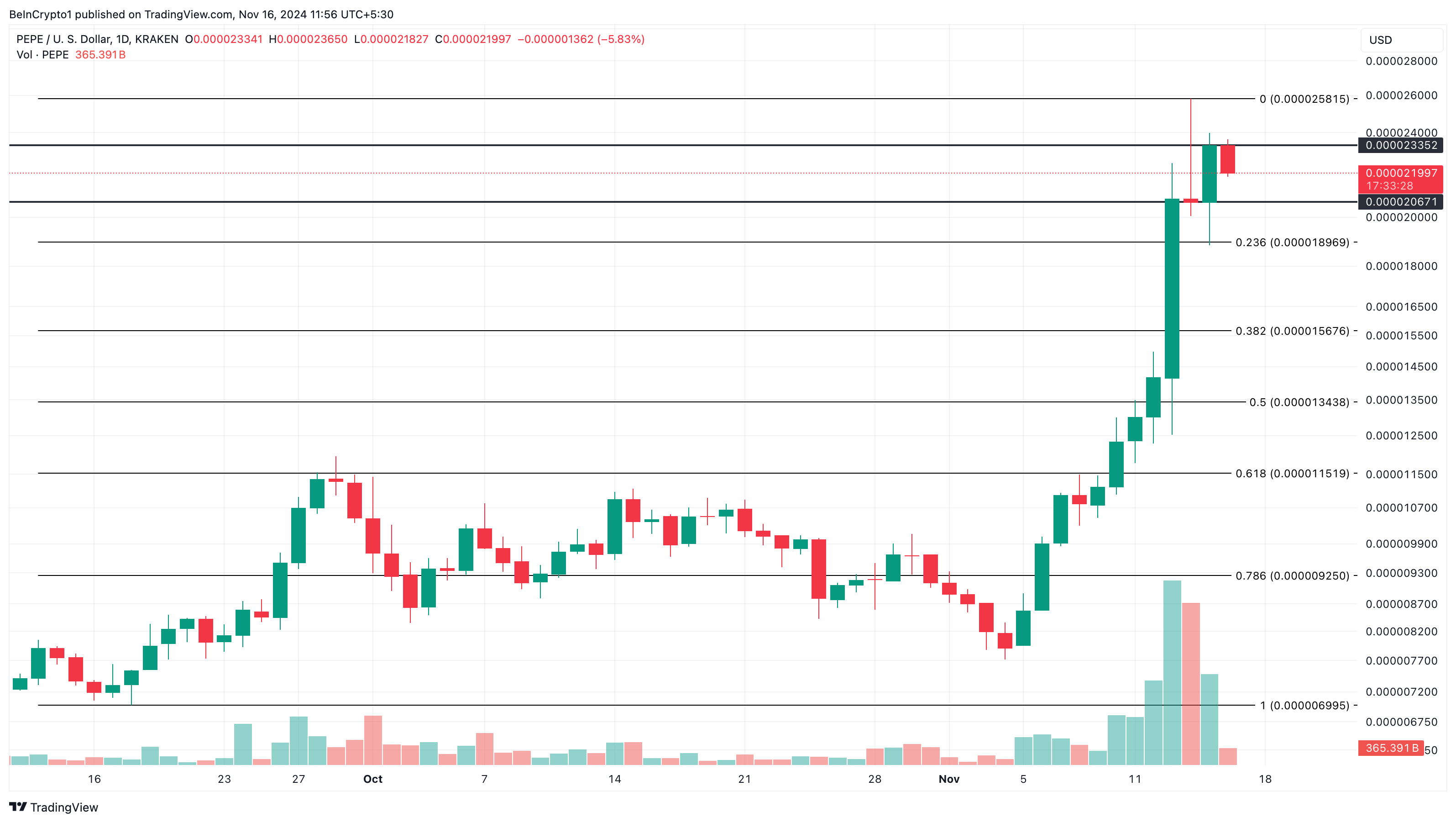 Päivittäisessä kaaviossa PEPE on kohdannut vastustusta 0,000023 dollarin kohdalla, mikä viittaa siihen, että karhut pyrkivät vetämään hinnan alas. Kuitenkin härät näyttävät puolustavan tukea 0,000021 dollarin kohdalla.