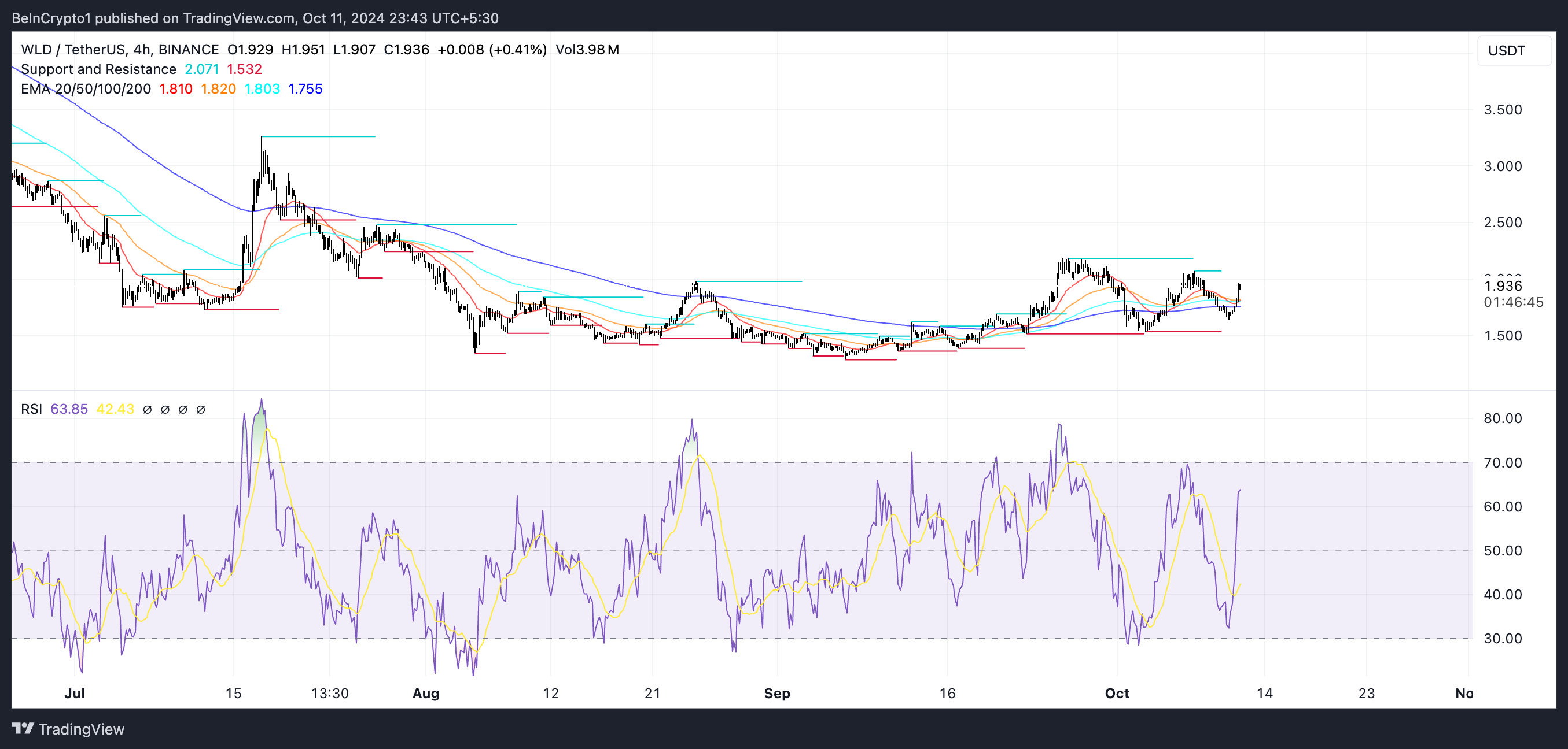 WLD:n RSI on tällä hetkellä 63,85, mikä viittaa siihen, että omaisuusvara lähestyy yliostettua tilaa, mutta tilaa nousulle on vielä. Jotta WLD voisi palata 2,5 dollariin, on välttämätöntä ylittää keskeiset vastustustasot 1,93, 2 ja 2,17 dollarissa. Näiden vastuspisteiden läpäiseminen lisäisi mahdollisuuksia saavuttaa 2,5 dollaria, mikä olisi WLD:n korkein hinta heinäkuun jälkeen.