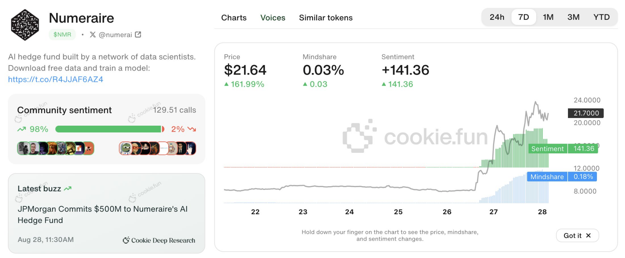 “JP Morgan sitoutui puoleen miljardiin Numeraille. Mielipide ja tunnelma nousivat lähes tasaisesta tasosta huippulukemiin uutisten julkistamisen jälkeen, ja $NMR seurasi, nousten yli 160 % sen jälkeen. Viittaako tämä Wall Streetin kasvavaan vaikutusvaltaan kryptomarkkinoilla?” Cookie DAO totesi.