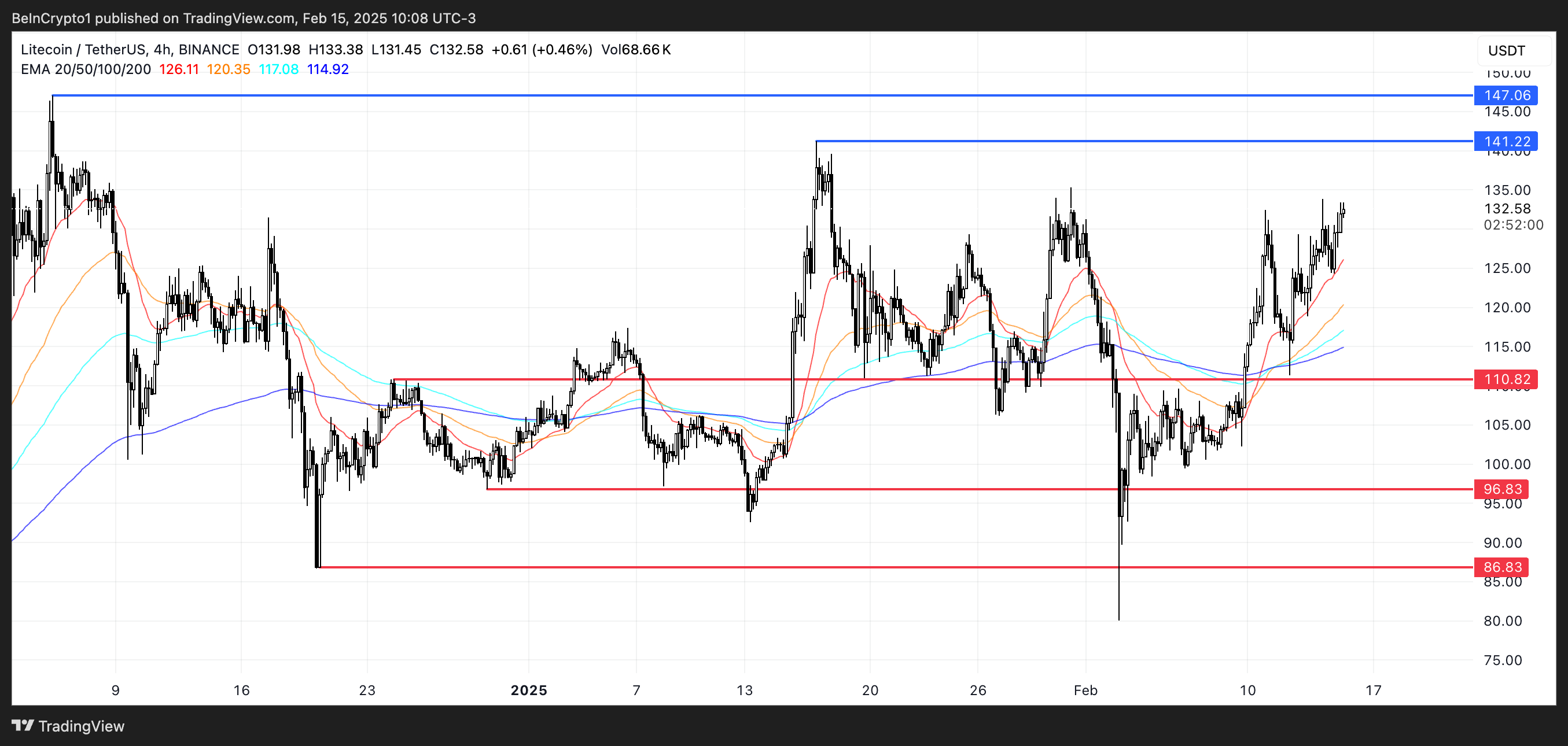 Tämä nousujohteinen asettelu viittaa siihen, että tunnelma pysyy vahvana. Jos suuntaus pitää, LTC voisi testata vastustusta 141 ja 147 dollarissa. Läpimurto näiden tasojen yläpuolella voisi nostaa LTC:n kohti 150 tai jopa 160 dollaria, mikä merkitsisi sen korkeinta hintaa sitten joulukuun 2021.