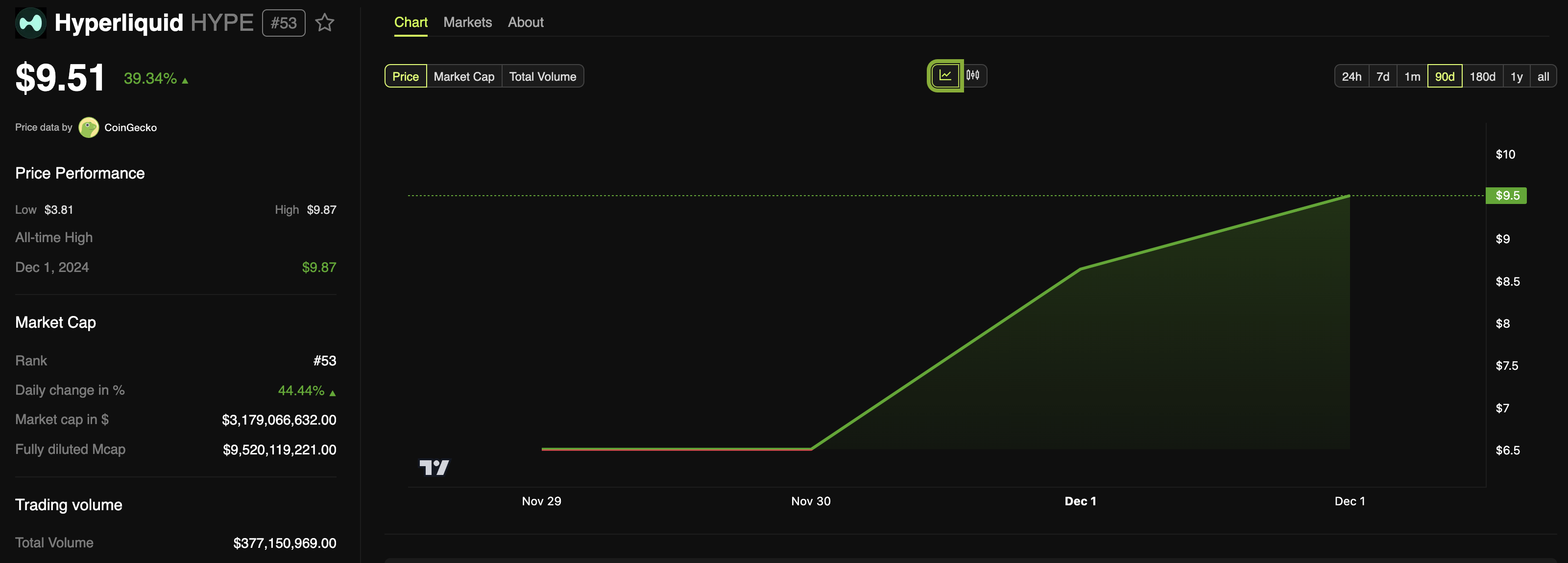 Kirjoitushetkellä HYPE:n hinta oli noussut 9,51 dollariin, vaikka sitä ei ole listattu millään keskitettyllä pörssillä (CEX). Useimmissa tapauksissa, kun altcoinit lanseerataan ilman CEX:ää, kysyntä on suurempaa, ja siksi hinta voi nousta.
