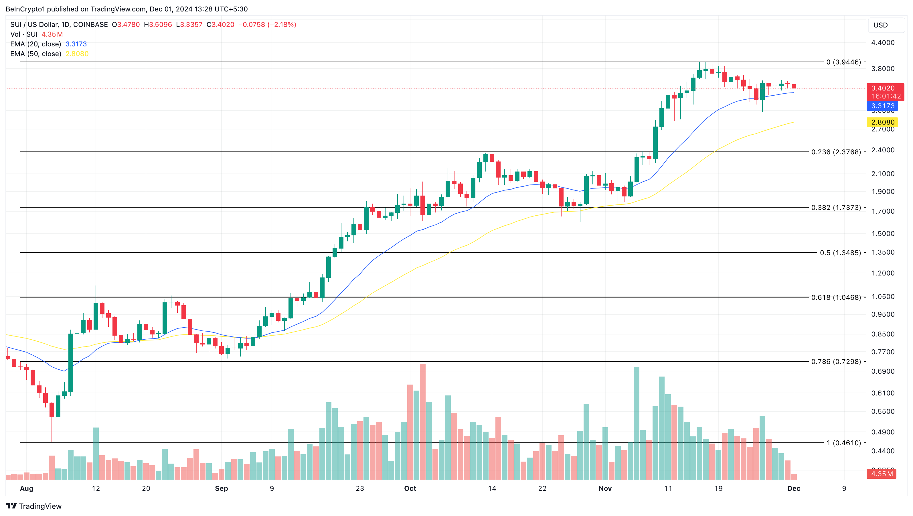 SUI:n ollessa 3,40 dollaria, on mahdollista, että se voisi nousta yli 4,40 dollariin joulukuussa 2024. Jos token kuitenkin kohtaa suurta myyntipainetta, tämä ei ehkä tapahdu. Tällöin hinta voisi laskea 2,38 dollariin.