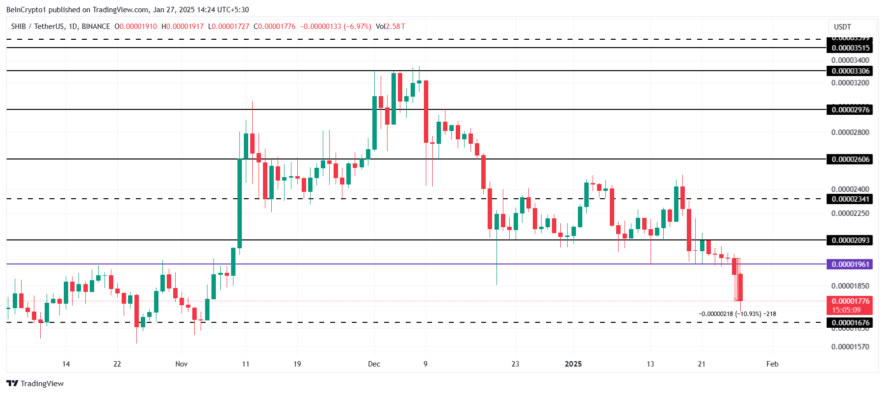 Shiba Inun hinta laski 11 % viimeisen 24 tunnin aikana, ja se on nyt 0,00001776 dollaria. Tämä lasku palautti meemikolikon konsolidaatioalueelle 0,00001961 ja 0,00001676 dollarin välillä. Sijoittajat seuraavat nyt tarkasti merkkejä toipumisesta tai lisälaskusta.
