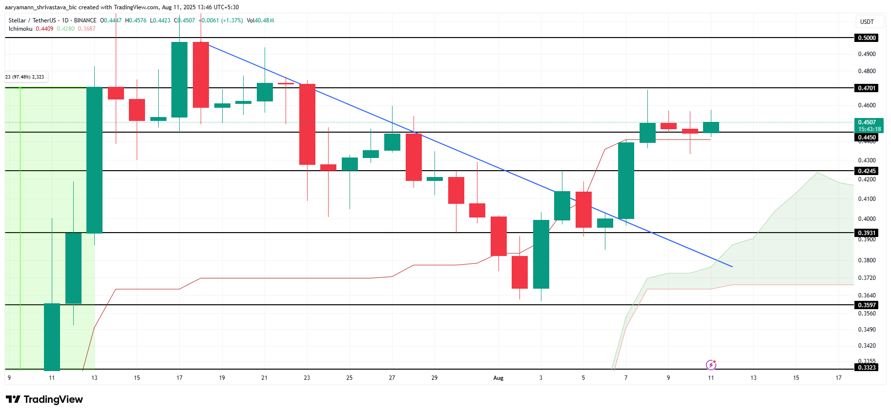 Jos raportti luo positiivista tunnelmaa, XLM voi ylittää 0,470 dollaria, tavoitellen 0,500 dollaria. Jos sijoittajat kuitenkin alkavat myydä, XLM voi pudota takaisin 0,424 dollariin tai alemmaksi, mikä voi mitätöidä nousujohteisen näkemyksen.