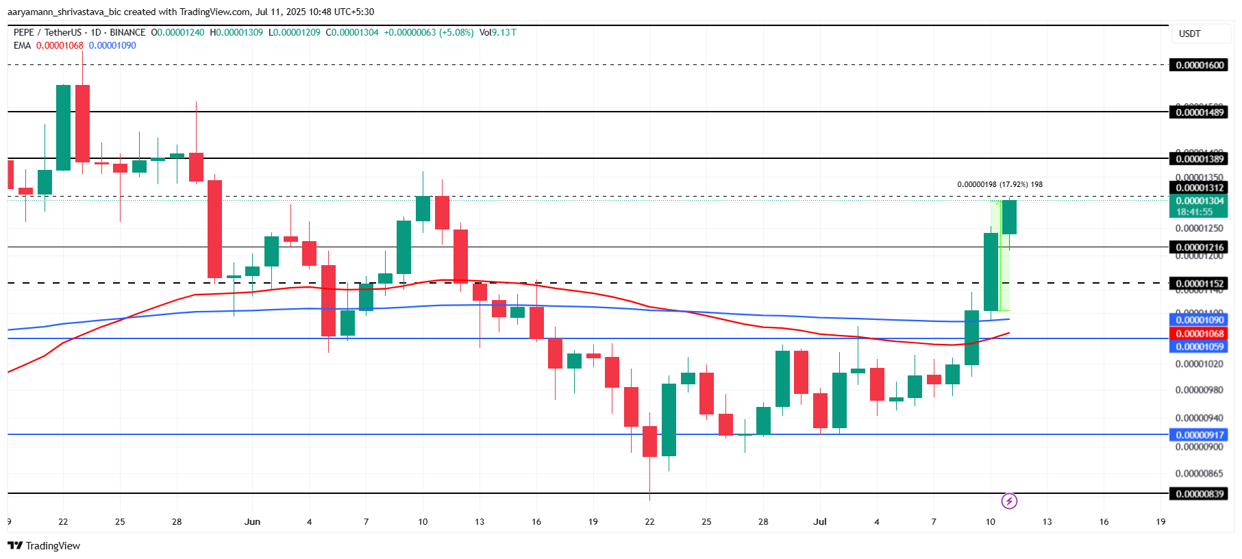 PEPE nousi 18 %, ja siitä tuli yksi päivän suurimmista altcoineista, ja sen nykyinen hinta on 0,00001304 dollaria. Juuri alle 0,00001312 dollarin vastustason PEPE osoittaa vahvaa suuntausta. Tämä nousuliike viittaa kasvavaan sijoittajien kiinnostukseen, ja jos vastustaso rikotaan lähitulevaisuudessa, kasvu voi jatkua.