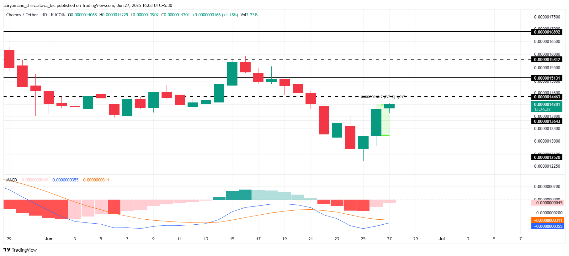 CHEEMS on noussut 7 % viimeisen 24 tunnin aikana, osoittaen vahvaa nousutunnelmaa. MACD näyttää nousuristeämisen, mikä viittaa siihen, että nousutrendi todennäköisesti jatkuu viikonloppuun. Tämä osoittaa, että CHEEMS voi säilyttää positiivisen suuntauksensa, kun markkinatunnelma paranee tulevina päivinä.