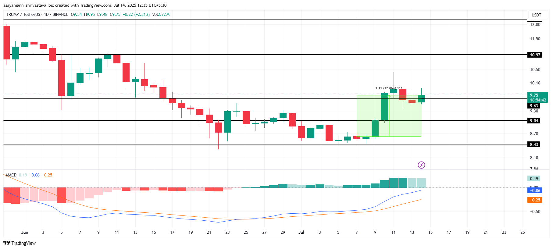 90 miljoonan TRUMP-tokenin vapauttaminen voi nostaa hintaa, ja odotuksena on saavuttaa 9,63 dollaria tukitasona. Jos näin tapahtuu, TRUMP voi nousta 10,97 dollariin, mikä merkitsisi kuukausittaista huippua.