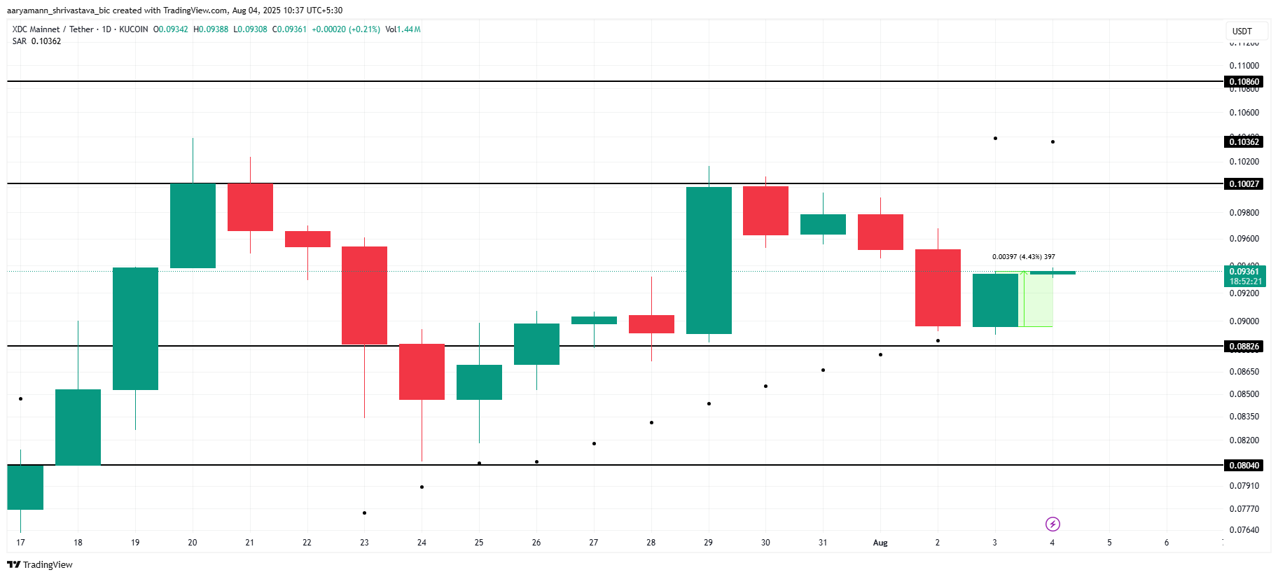 Kuitenkin Parabolic SAR kynttilänjalkojen yläpuolella osoittaa mahdollisen laskusuuntauksen XDC:lle. Jos markkinatunnelma muuttuu karhumaiseksi, hinta voi laskea 0,08826 dollariin. Pudotus tämän tason alle mitätöisi nousunäkymät ja viittaisi lisäriskistä XDC:lle.