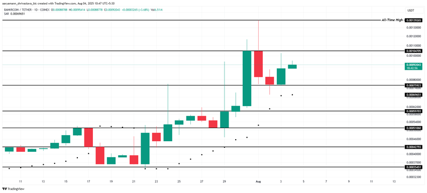 BNKR on noussut 18 % viimeisen 24 tunnin aikana, ja sen kauppahinta on 0,000920 dollaria. Viime viikolla saavutetun kaikkien aikojen korkeimman 0,001392 dollarin tason jälkeen altcoin pyrkii palaamaan tälle tasolle. Tämän saavuttamiseksi sen on varmistettava 0,001047 dollaria tukena, mikä auttaisi ylläpitämään noususuuntausta.