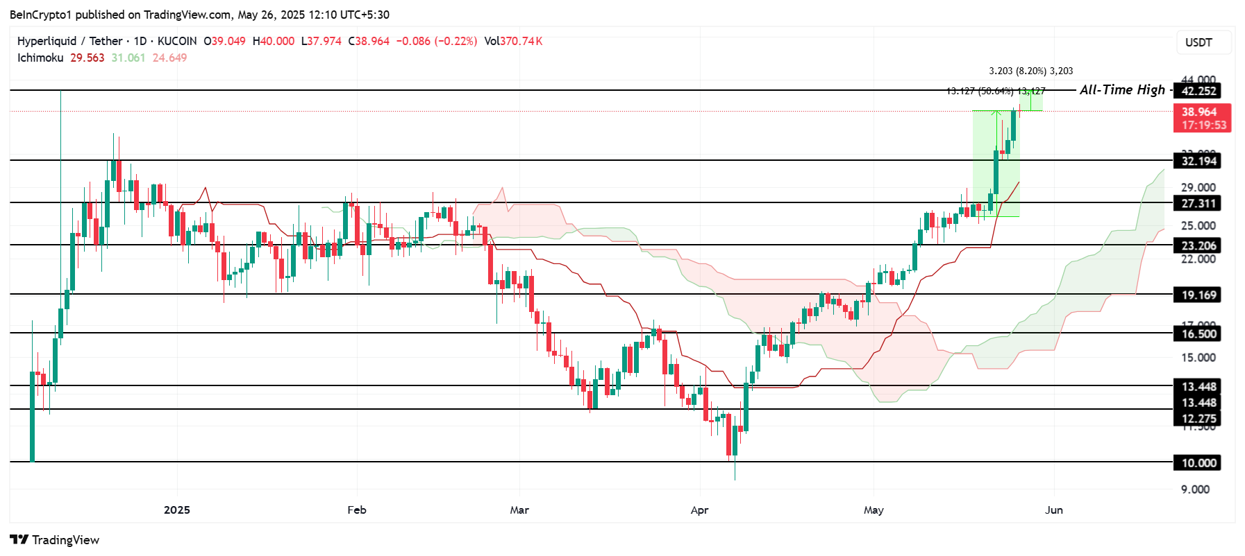 Ichimoku Cloud -indikaattori, joka sijaitsee kynttilänjalkojen alapuolella, tukee HYPE:n jatkuvaa noususuuntausta. Tämä tekninen asettelu viittaa siihen, että HYPE voisi jatkaa vaikuttavaa 50 %:n nousuaan tällä viikolla ja saavuttaa uuden kaikkien aikojen ennätyksen.
