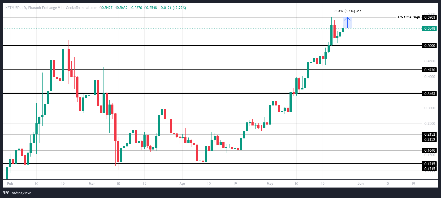 KET:n nykyinen hinta on 0,554 dollaria, mikä on alle 6,3 % sen kaikkien aikojen ennätyksestä (ATH) 0,590 dollaria. Jos KET rikkoo tämän vastuksen, se merkitsee meemikolikon toista ATH:ta viikon sisällä, mikä osoittaa vahvaa noususuuntausta, jota sijoittajien kannattaa seurata.