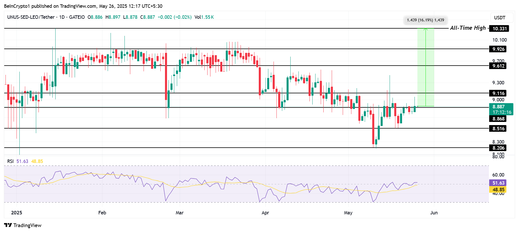 Epäedulliset markkinaolosuhteet voivat kuitenkin pitää LEO:n alle 9,11 dollarissa. Hinta saattaa konsolidoitua yli 8,86 dollarin tai jopa laskea kohti 8,51 dollaria, mikä heijastaa varovaista sijoittajatunnelmaa ja mahdollisia laskupaineita.