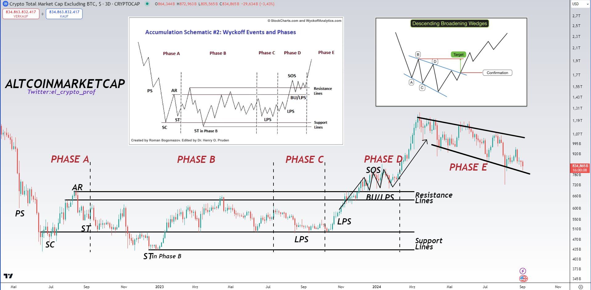 Toinen analyytikko, Mustache, huomauttaa, että altcoinit ovat ylläpitäneet täydellistä Wyckoffin kerrytyskuviota useiden vuosien ajan. Hän ehdottaa, että altcoinit ovat nyt konsolidoitumassa ennen seuraavaa ylöspäin suuntautuvaa liikettään, kun hintatoiminta tiukentuu laskevassa laajenevassa kiilakuviossa.