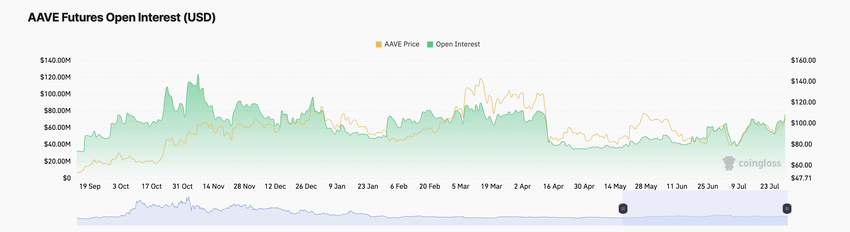 Tämä hintaralli on johtanut nousuun AAVE:n johdannaismarkkinoiden toiminnassa, mikä heijastuu nousevana futuurien Open Interestina. Coinglassin mukaan tokenin futuurien Open Interest on kasvanut 36% viimeisen seitsemän päivän aikana. Lehdistöhetkellä AAVE:n futuurien Open Interest on 76 miljoonaa dollaria.