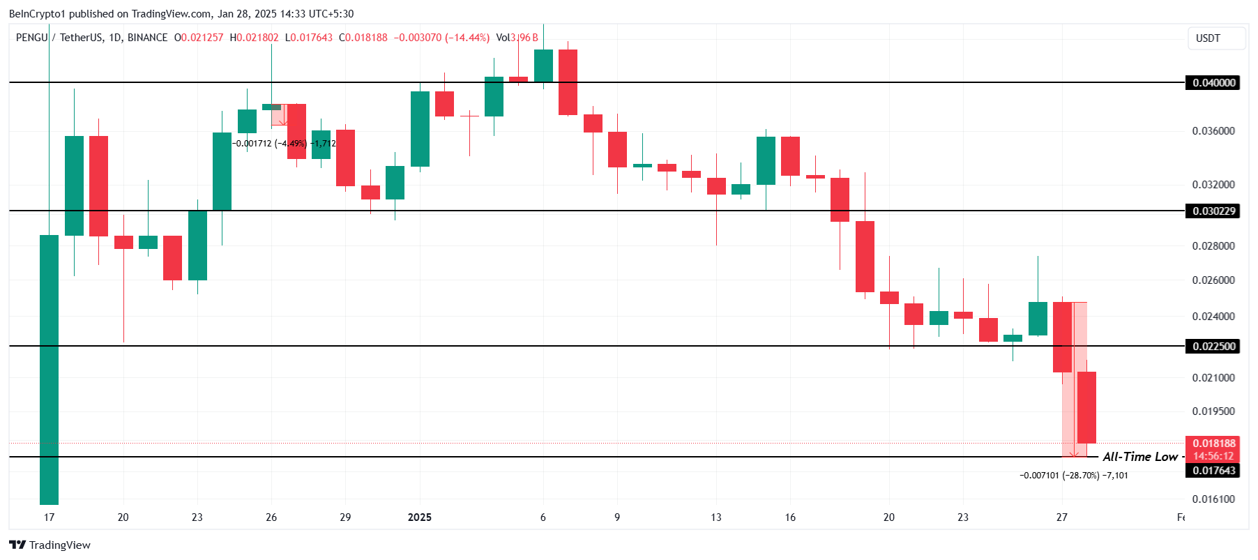 PENGU on kokenut jyrkän 28 % laskun viimeisen 24 tunnin aikana, pudoten 0,0176 dollariin päivänsisäisissä pohjissa, mikä merkitsi uutta kaikkien aikojen alinta tasoa. Tämä merkittävä pudotus heijastaa voimakasta karhupainetta ja korostaa altcoinin kamppailua ylläpitää noususuuntausta nykyisessä markkinaympäristössä.