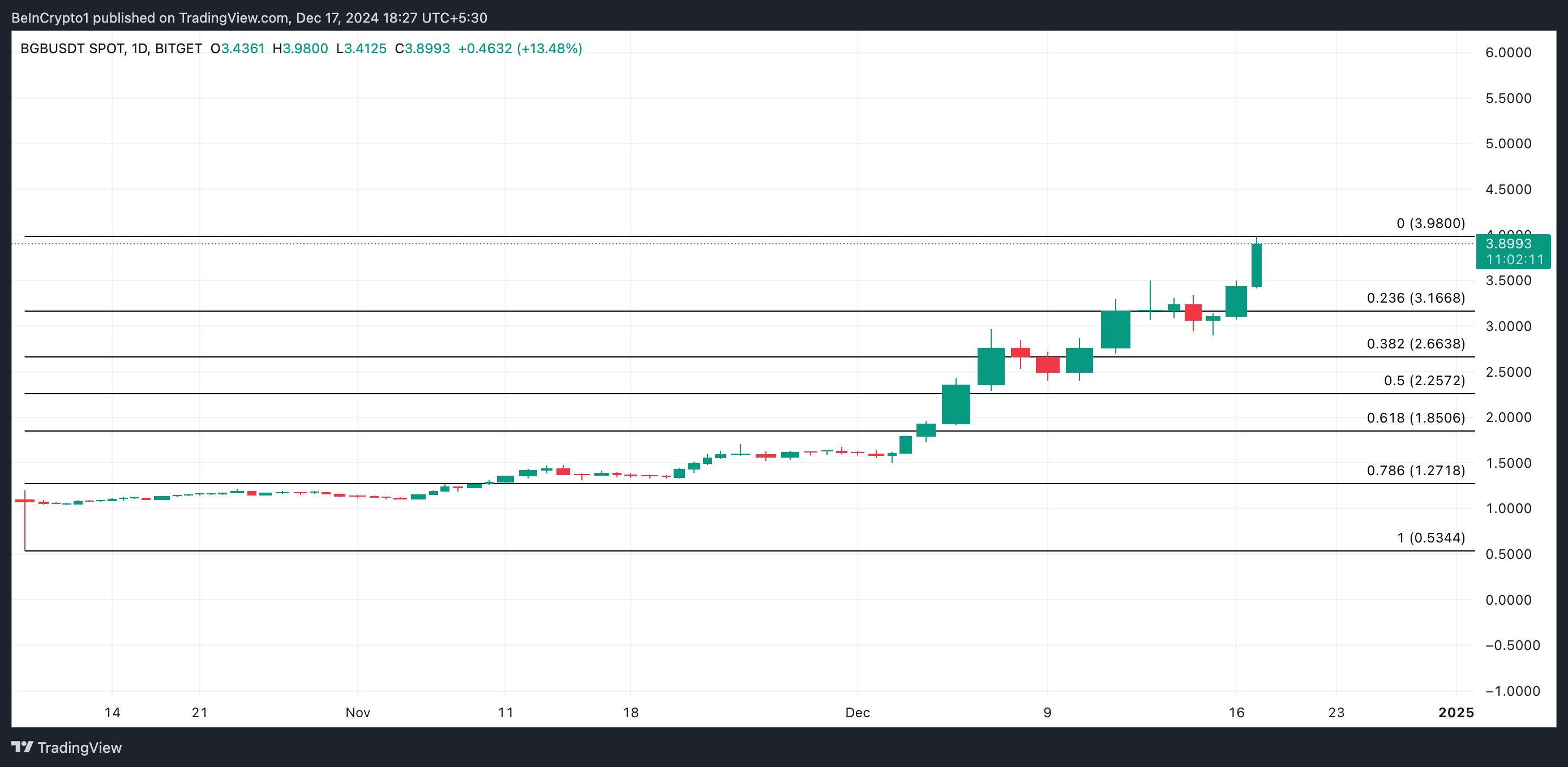 Bitget Token (BGB) on Bitget-kryptovaluuttapörssin natiivi hyötytoken. Se on yksi altcoineista, joka nousi tänään uuteen huippuun. Se kirjasi 18 %:n päivänsisäisen nousun ja saavutti kaikkien aikojen ennätyksen 3,98 dollaria. Viimeisen 24 tunnin aikana sen kaupankäyntivolyymi on ollut yhteensä 256 miljoonaa dollaria, nousten 12 %.