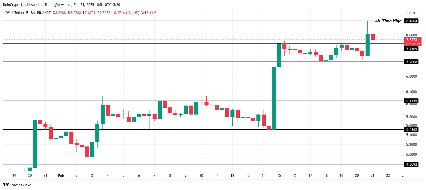 OM:n hinta saavutti äskettäin uuden kaikkien aikojen korkeimman tason 8,46 dollaria, ja se on nyt 7,85 dollaria. Kryptovaluutta on kokenut vahvaa noususuuntausta, mikä viittaa siihen, että sen nousu voi jatkua tulevina päivinä.