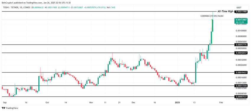 TOSHI koki huikean 157 % nousun viimeisen 24 tunnin aikana, saavuttaen uuden kaikkien aikojen huipun (ATH) 0,00211 dollaria. Tämä nousu seurasi kryptovaluutan onnistunutta tukitason vakiinnuttamista 0,00057 dollarissa. Jyrkkä nousu korostaa kasvavaa sijoittajien kiinnostusta ja markkinatoimintaa tokenin ympärillä, mikä viittaa vahvaan lyhyen aikavälin suuntaukseen.
