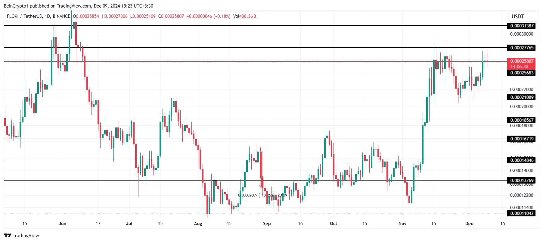 FLOKI-hinta testaa tällä hetkellä 0,0002568 dollarin tukitasoa, pyrkien pitämään tämän hintapisteen säilyttääkseen viimeaikaiset voittonsa. Tuen onnistunut varmistaminen voisi nostaa meemikolikon 0,0002776 dollariin, missä lisähärkämarkkinavauhtia saattaa seurata.
