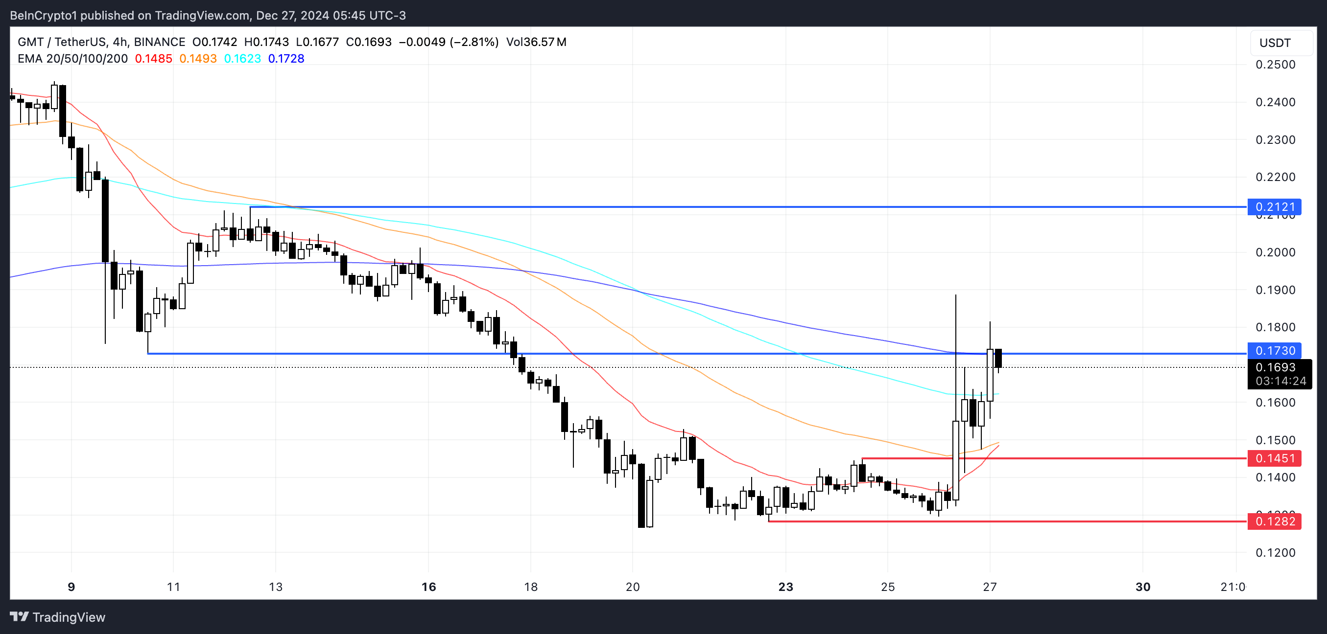 GMT:n markkina-arvo on nyt 442 miljoonaa dollaria. Jos se ylittää vastustason 0,173 dollarissa, hinta voi nousta edelleen testatakseen 0,21 dollaria. Tämä läpimurto osoittaisi tokenin jatkuvaa nousumomentumia.