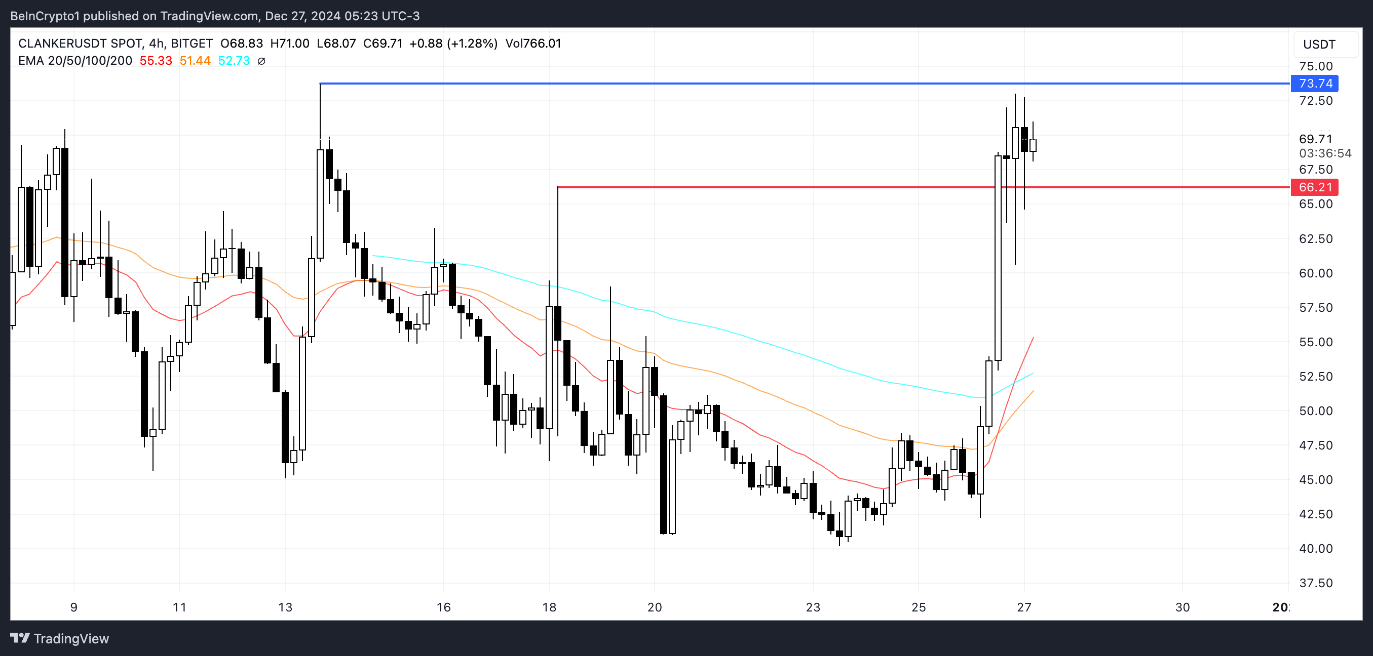 Jos nykyinen nousutrendi jatkuu ja CLANKER ylittää 73,7 dollarin vastustason, hinta voi testata 75 ja 80 dollaria. Jos suunta hidastuu, hinta saattaa sen sijaan testata tukitasoa 66 dollarissa, mikä voi merkitä lyhyen aikavälin hinnan suunnan muutosta.