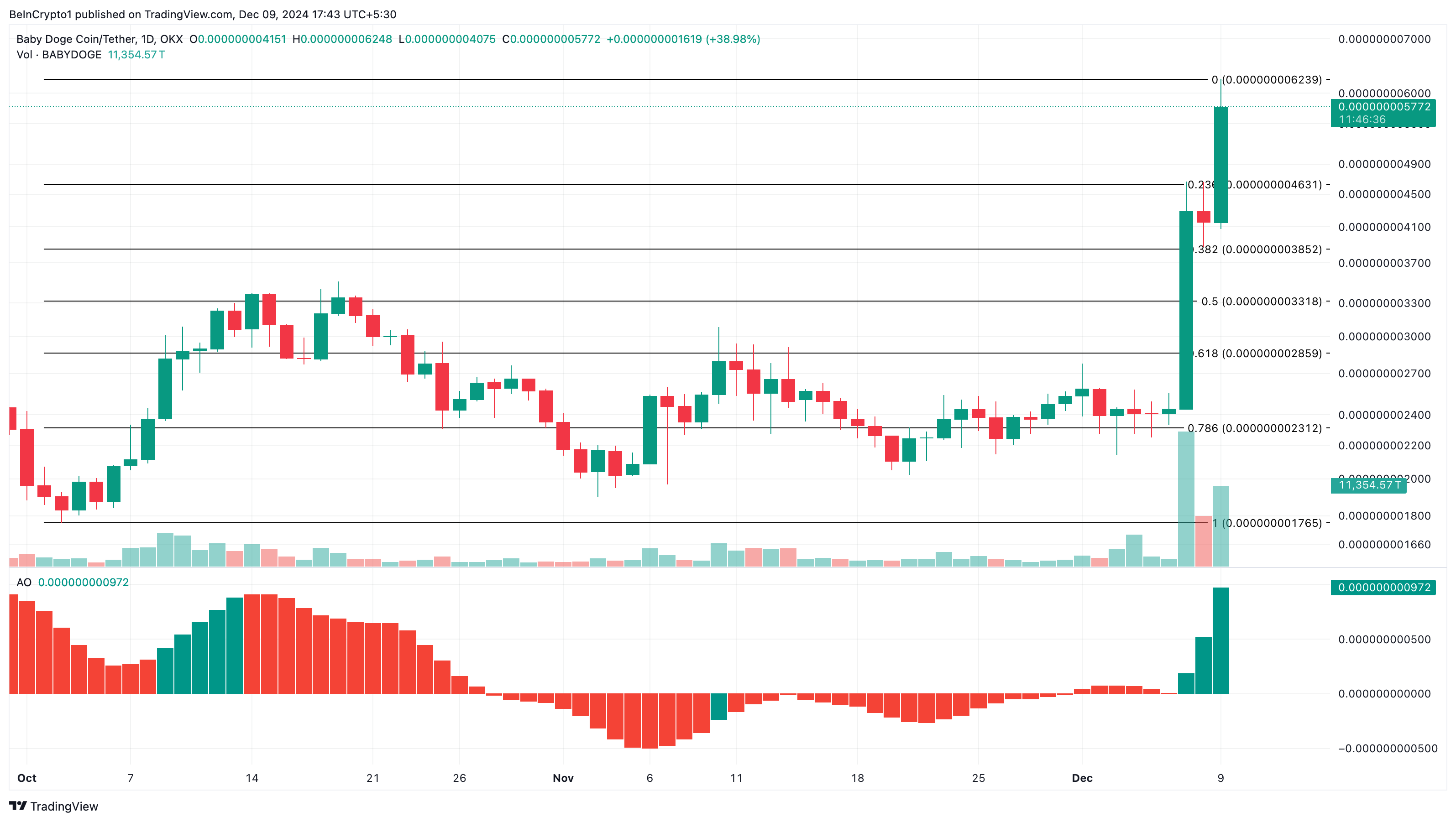 Päivittäistä kaaviota tarkasteltaessa Awesome Oscillator (AO) -lukema on noussut positiiviselle alueelle. Tämä osoittaa kasvavaa ostopainetta ja härkämäistä momenttia altcoinin ympärillä. Jos tämä pysyy samana, BABYDOGE:n hinta voisi nousta yli korkeimman pisteen, joka on 0,0000000062 dollaria.