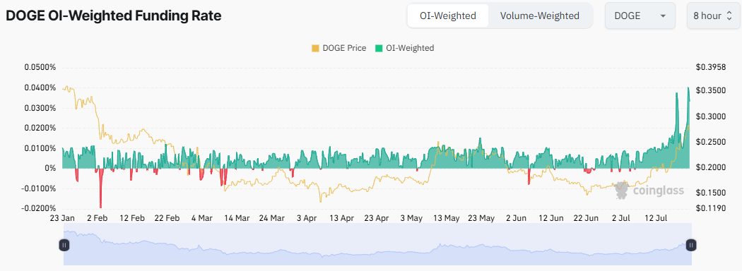 Coinglassin tiedot osoittavat, että DOGE:n Funding Rate saavutti vuosittaisen huippunsa 21. heinäkuuta, kun hinta palasi 0,28 dollariin. Monet lyhyen aikavälin kauppiaat avasivat pitkiä positioita toivoen, että DOGE jatkaisi nousuaan.