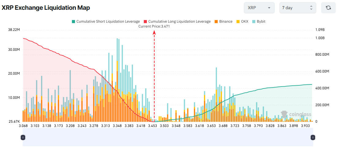 7 päivän likvidointikartan mukaan pitkien positioiden kokonaislikvidointi ylittää huomattavasti lyhyiden positioiden likvidoinnin. Jos XRP laskee tällä viikolla 3 dollariin, pitkien positioiden likvidoinnit voivat nousta lähes miljardiin dollariin.