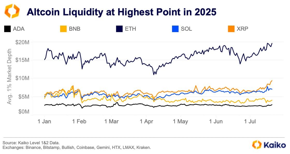 Kaikon tuorein raportti osoittaa kuitenkin, että XRP:n 1 % markkinasyvyys saavutti uuden vuosittaisen huippunsa lähes 10 miljoonaan dollariin spot-markkinoilla. Tämä sijoittaa sen SOL:n, BNB:n ja ADA:n yläpuolelle, vain ETH:n jälkeen.