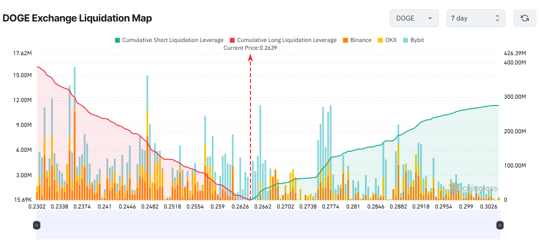 Kirjoitushetkellä DOGE on pudonnut heinäkuun huipustaan 0,28 dollarista 0,266 dollariin. 7 päivän likvidointikartta osoittaa, että jos DOGE laskee tällä viikolla 0,236 dollariin, pitkien positioiden kokonaislikvidoinnit voivat nousta 300 miljoonaan dollariin.