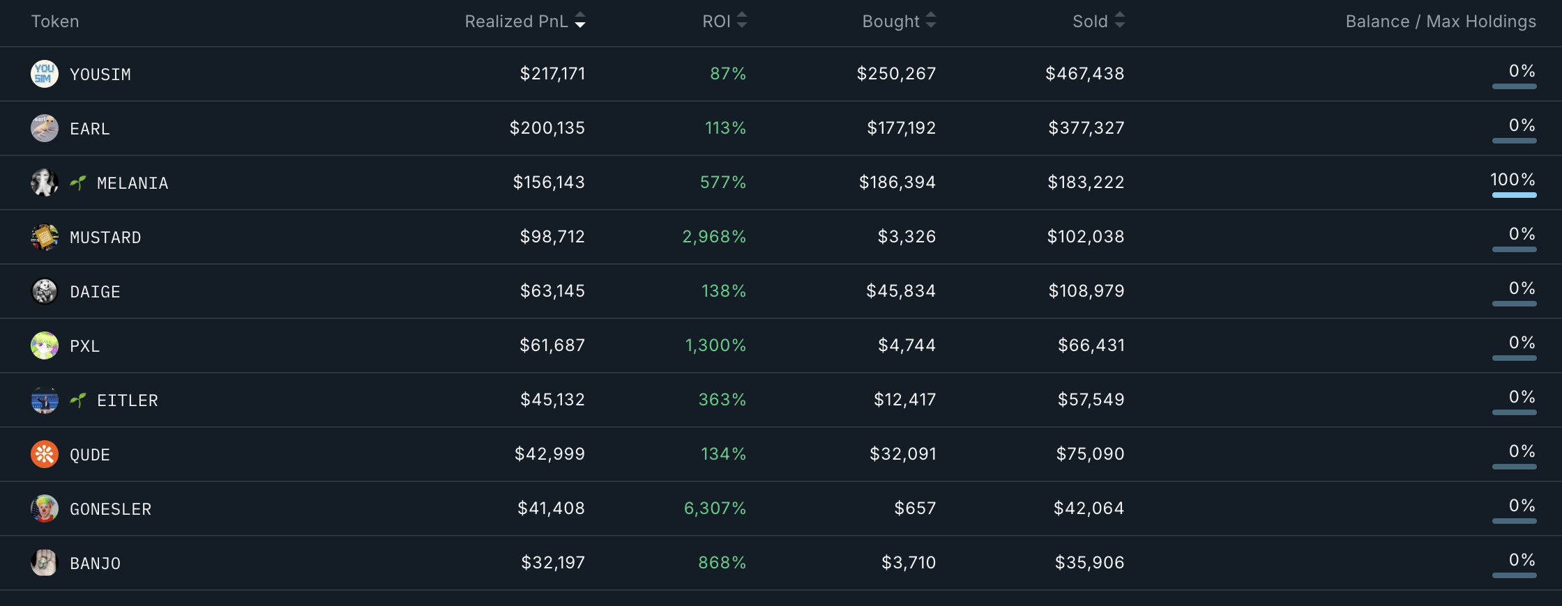 Lompakko on tuottanut poikkeuksellisia tuottoja, mukaan lukien huikea 6 307 % voitto GONESLERista, muuttaen 657 dollarin sijoituksen 42 064 dollariksi. Se saavutti myös 2 968 % tuoton MUSTARDista, muuttaen 3 326 dollaria 102 038 dollariksi. Lisäksi se on varmistanut yli 200 000 dollarin voitot kaupoista YOUSIMilla ja EARLilla.