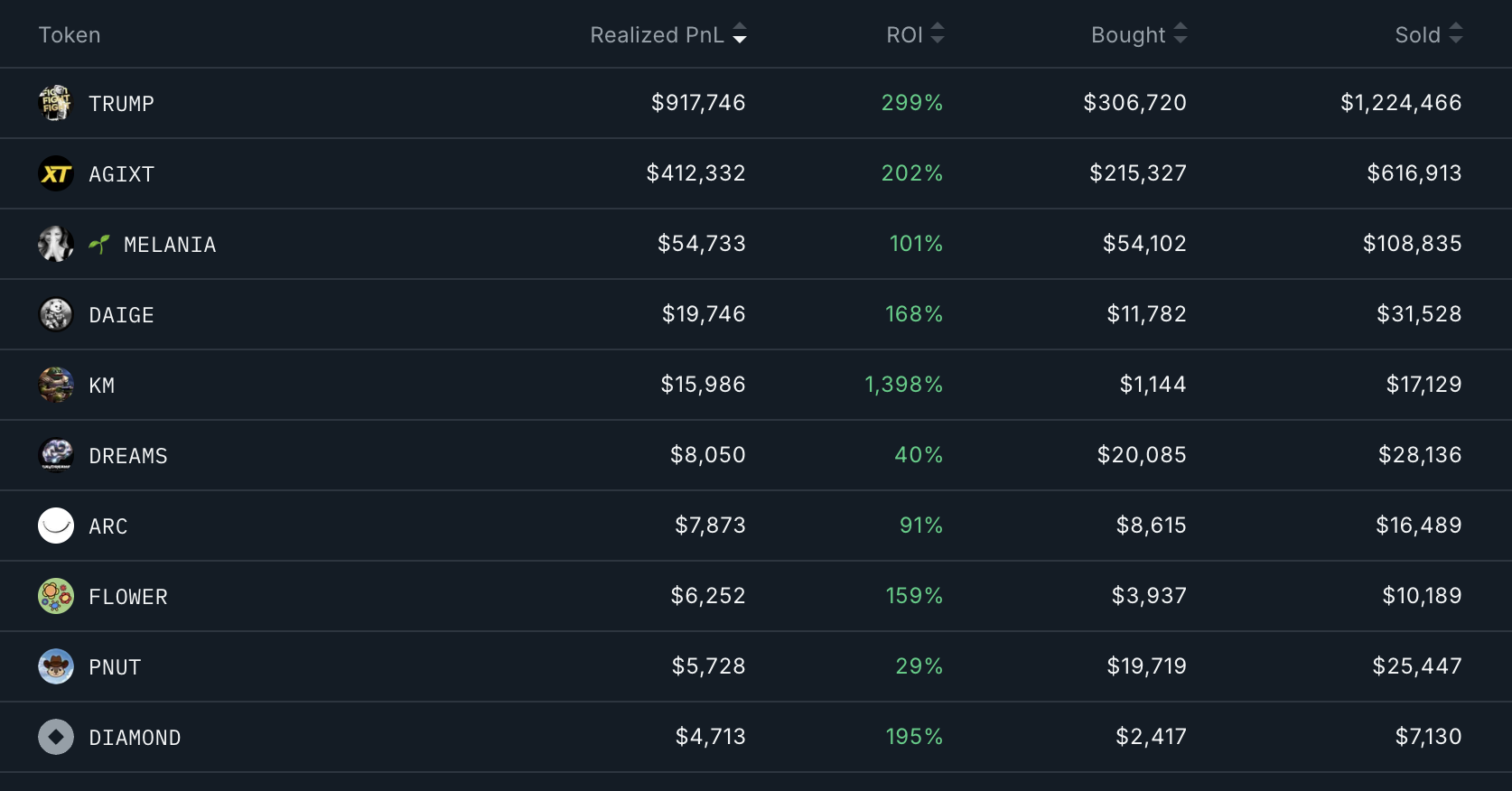 Huolimatta AI-erikoistumisestaan, lompakon merkittävin voitto tuli TRUMPista. Se sijoitti 306 720 dollaria tokeniin ja myi myöhemmin 1 224 466 dollarilla, varmistaen valtavan 917 746 dollarin voiton.