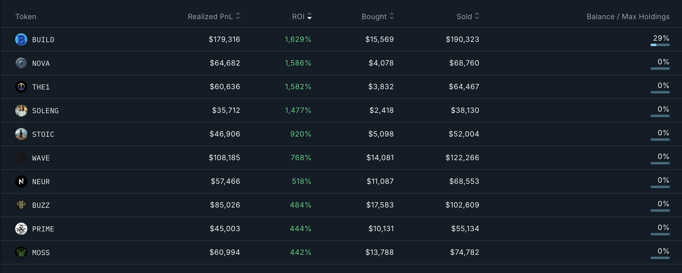 Viimeisten 90 päivän aikana lompakko on realisoinut 850 747 dollarin voiton 158 käydystä tokenista. Tyypillisesti sijoittaen 4 000 ja 50 000 dollarin välillä per token, lompakolla on edelleen realisoimaton 50 753 dollarin voitto BUILDista, mikä viittaa mahdollisuuteen lisävoittoihin.
