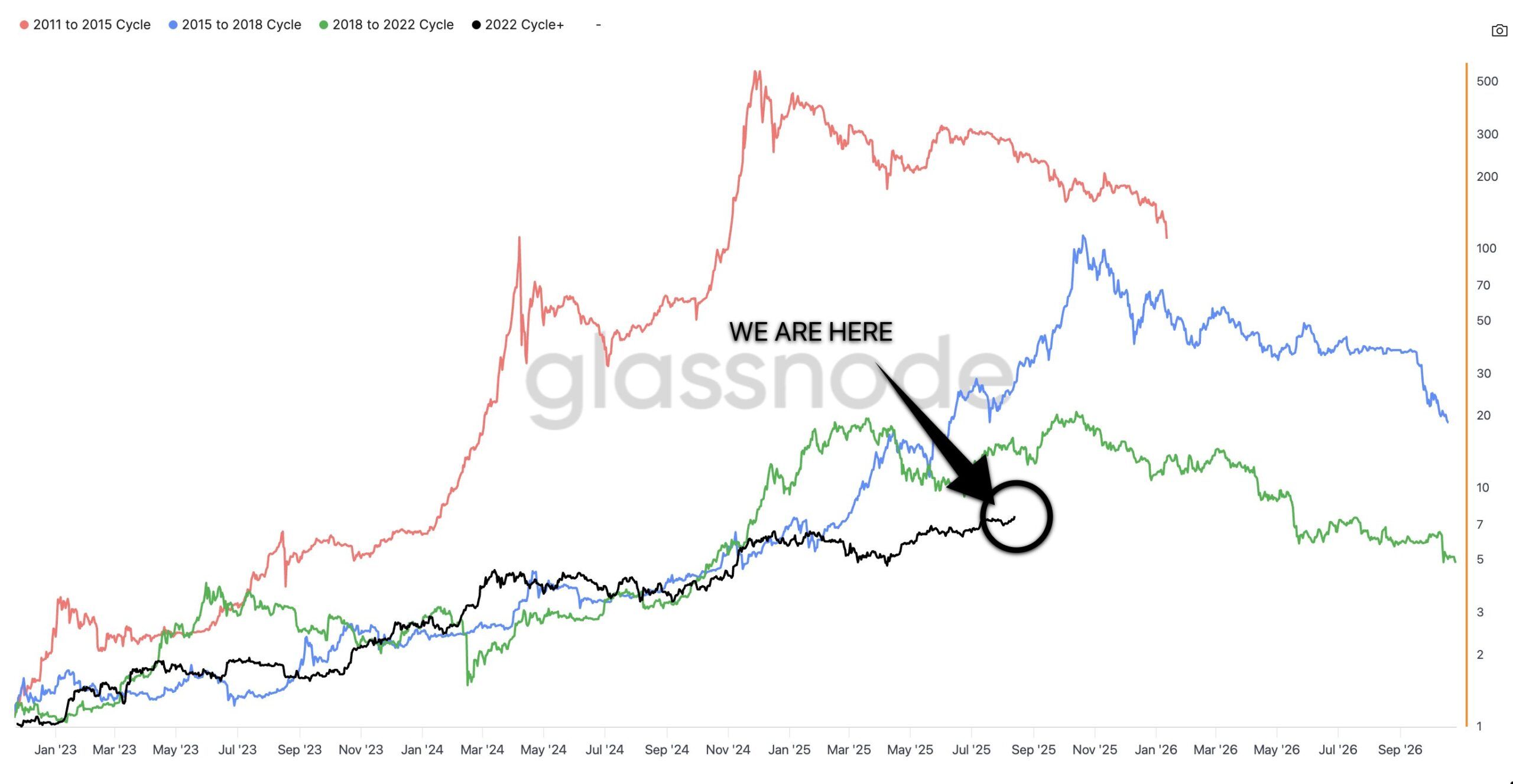 Huipun jälkeen historialliset trendit osoittavat, että karhumarkkinat kestävät tyypillisesti 370–410 päivää, ja keskimääräinen lasku on noin –66 %. Jos tämä skenaario toistuu, laskusuuntaus voisi alkaa vuonna 2026, mikä aloittaa syvän korjausvaiheen ennen seuraavan kertymisjakson alkamista.