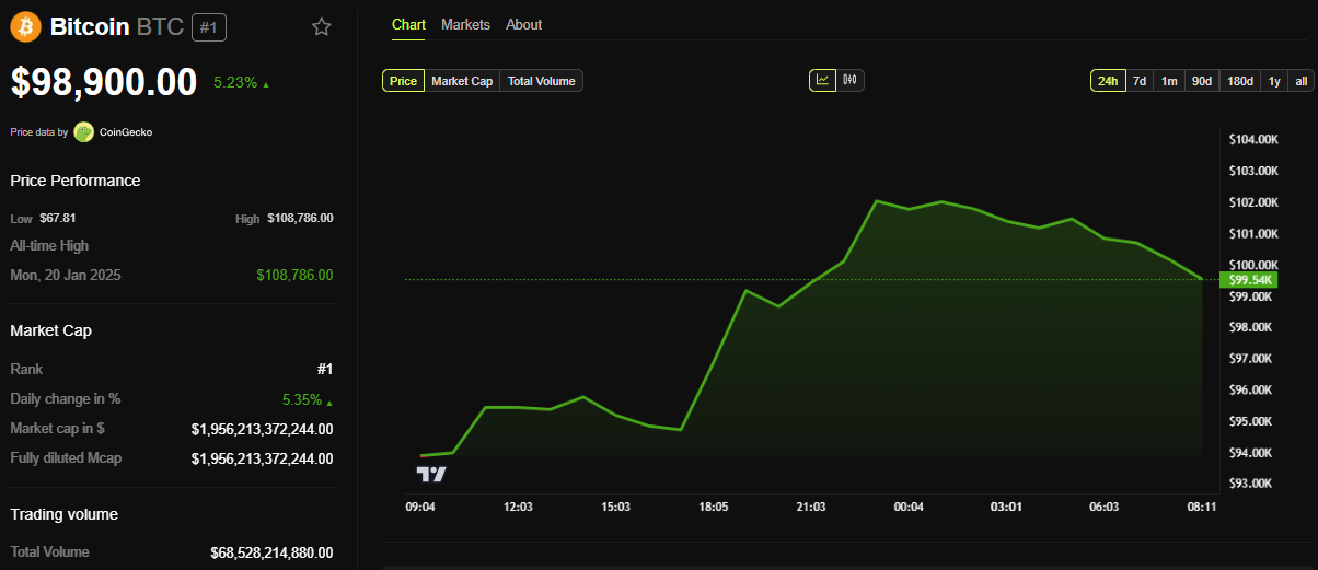 BeInCrypto-tiedot osoittavat, että BTC:n hinta oli 98 900 dollaria tätä kirjoitettaessa, yli 5% nousussa tiistain istunnon avauduttua.