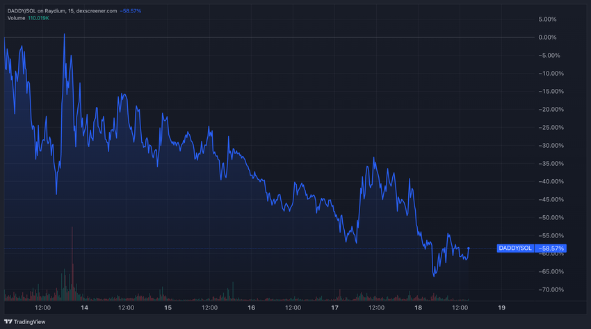 Näistä aloitteista huolimatta DADDY-meemikolikko kamppailee epävakailla markkinoilla. Kolikko on pudonnut lähes 60 % kesäkuun 12. päivän huipustaan.