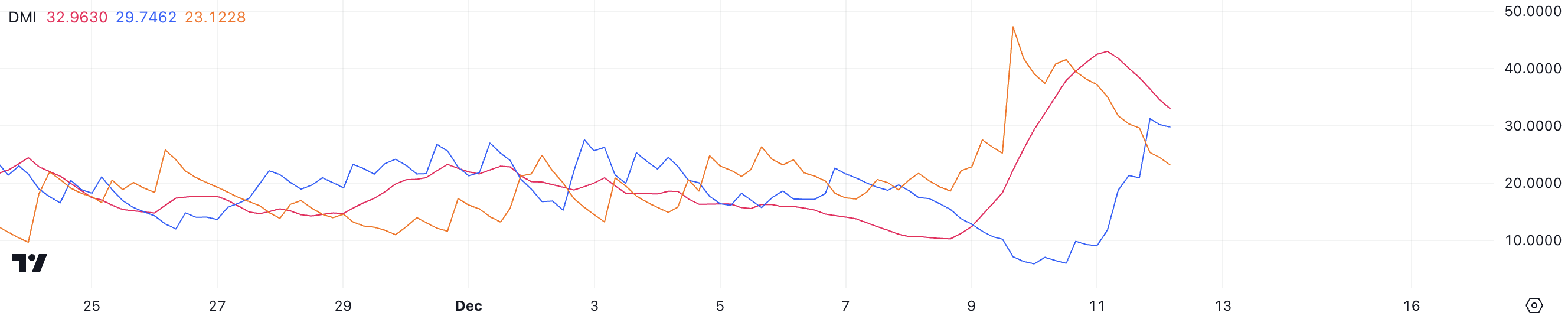Vaikka ADX on laskenut, tunnusluku pysyy yli 25:n kynnysarvon, mikä osoittaa, että trendi on yhä kohtalaisen vahva, vaikkakin vähemmän hallitseva kuin aiemmin.