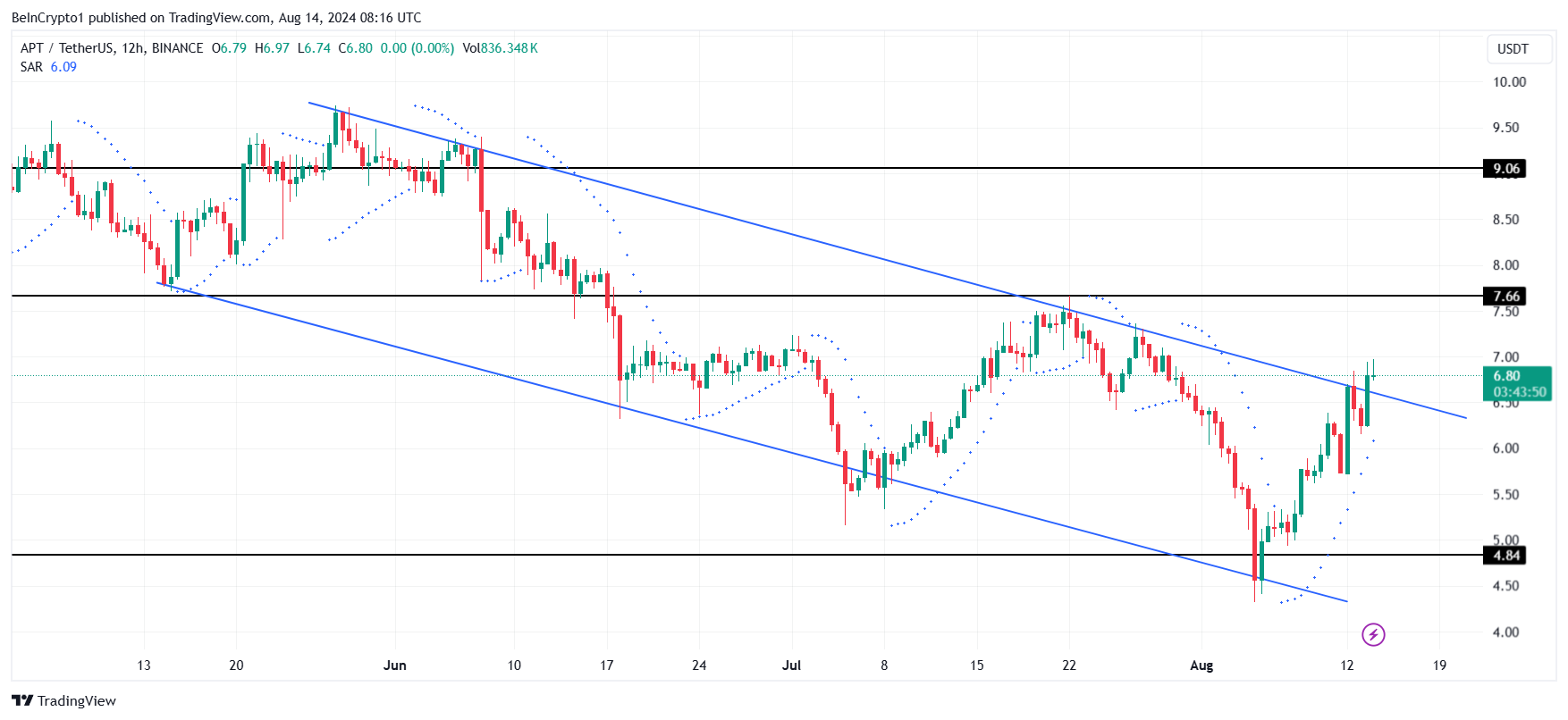 Aptoksen hintaa voidaan nähdä kaupankäynnissä 6,80 dollarissa ja samalla se murtautuu ulos laskevasta kanavasta. Nouseva laskeva kanava on kuvio, jossa hinta suuntautuu alaspäin yhdensuuntaisten viivojen välissä, mutta osoittaa korkeampia alamäkiä. Tämä on tyypillisesti merkki mahdollisesta käänteestä ylöspäin, kun hinta lähestyy kanavan alarajaa.