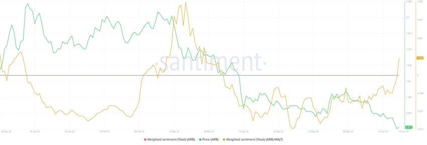 Ensimmäistä kertaa kolmeen kuukauteen tämä tunne on Arbitrumille myönteinen. Kun sijoittajien optimismi kasvaa, myös hinta voi.