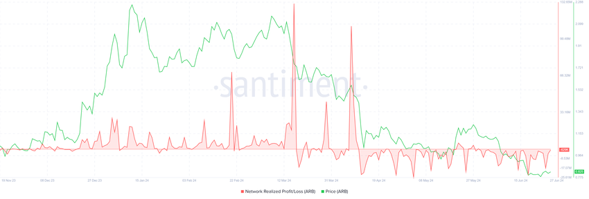 Arbitrumin hinta saattaa katsoa uutta kaikkien aikojen alinta tasoa, koska ARB: n haltijoiden optimismi on kadonnut kokonaan. Arbitrum-sijoittajat ovat kärsineet jatkuvia tappioita liiketoimistaan huhtikuun puolivälistä lähtien. Tätä jatkuvaa trendiä korostaa selvästi toteutuneen voiton / tappion mittari, joka korostaa sijoittajien kohtaamia taloudellisia haasteita.