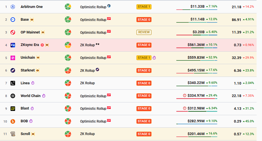 Arbitrum on Ethereumin suurin layer-two skaalausratkaisu, jota seuraavat muut toimijat samalla alalla, kuten Optimism (OP). L2Beatsin tiedot osoittavat, että Arbitrum One, optimistinen rollup, joka perii Ethereumin turvallisuuden julkaisemalla transaktiot lohkoketjuun, johtaa L2:ia TVL-tunnusluvuissa.