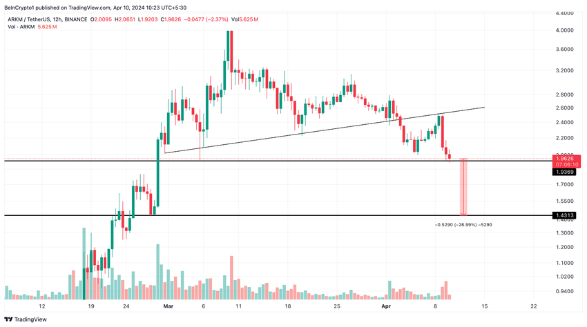 Se kuitenkin rikkoi tämän tuen 3. huhtikuuta, mikä kiihdytti hinnan laskua. Myöhemmin se testasi uudelleen trendiviivan, joka toimi vastuksena 8. huhtikuuta. Tällä hetkellä ARKM testaa uutta tukitasoa noin 1,93 dollarissa.