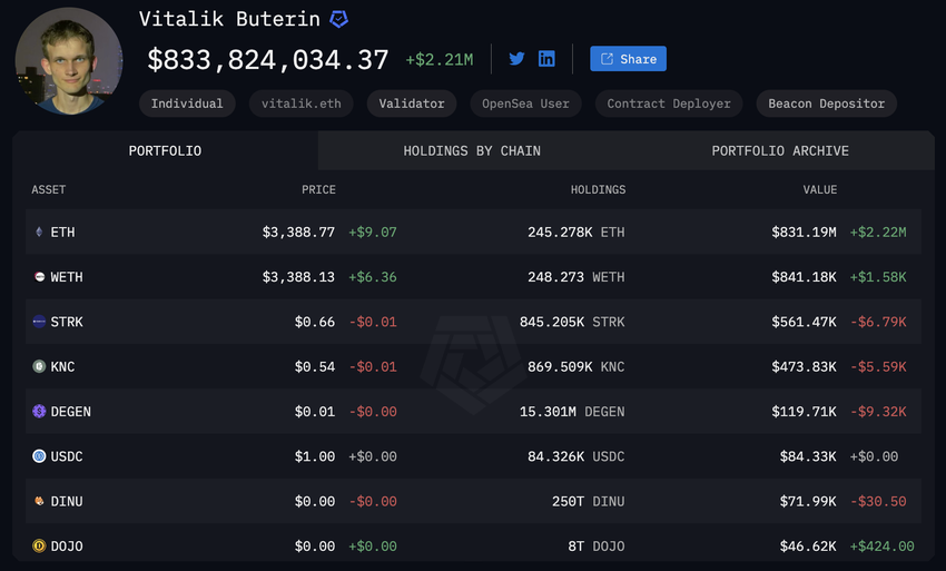 Ketjun analytiikkayrityksen Arkham Intelligencen mukaan Vitalik Buterinin nettovarallisuus nousi 552.86 miljoonasta dollarista vuoden 2024 alussa 834.66 miljoonaan dollariin kirjoitushetkellä.