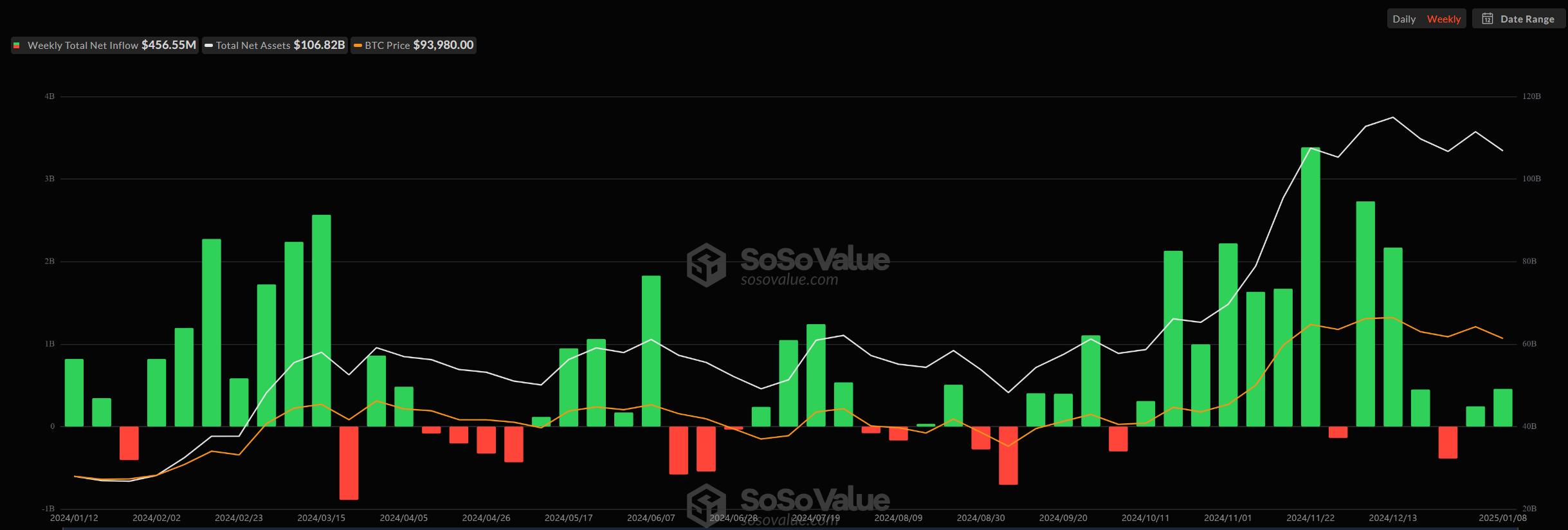 Yhdysvaltain Bitcoin ETF:t viikoittain tammikuusta 2024 alkaen. Lähde: SoSoValue